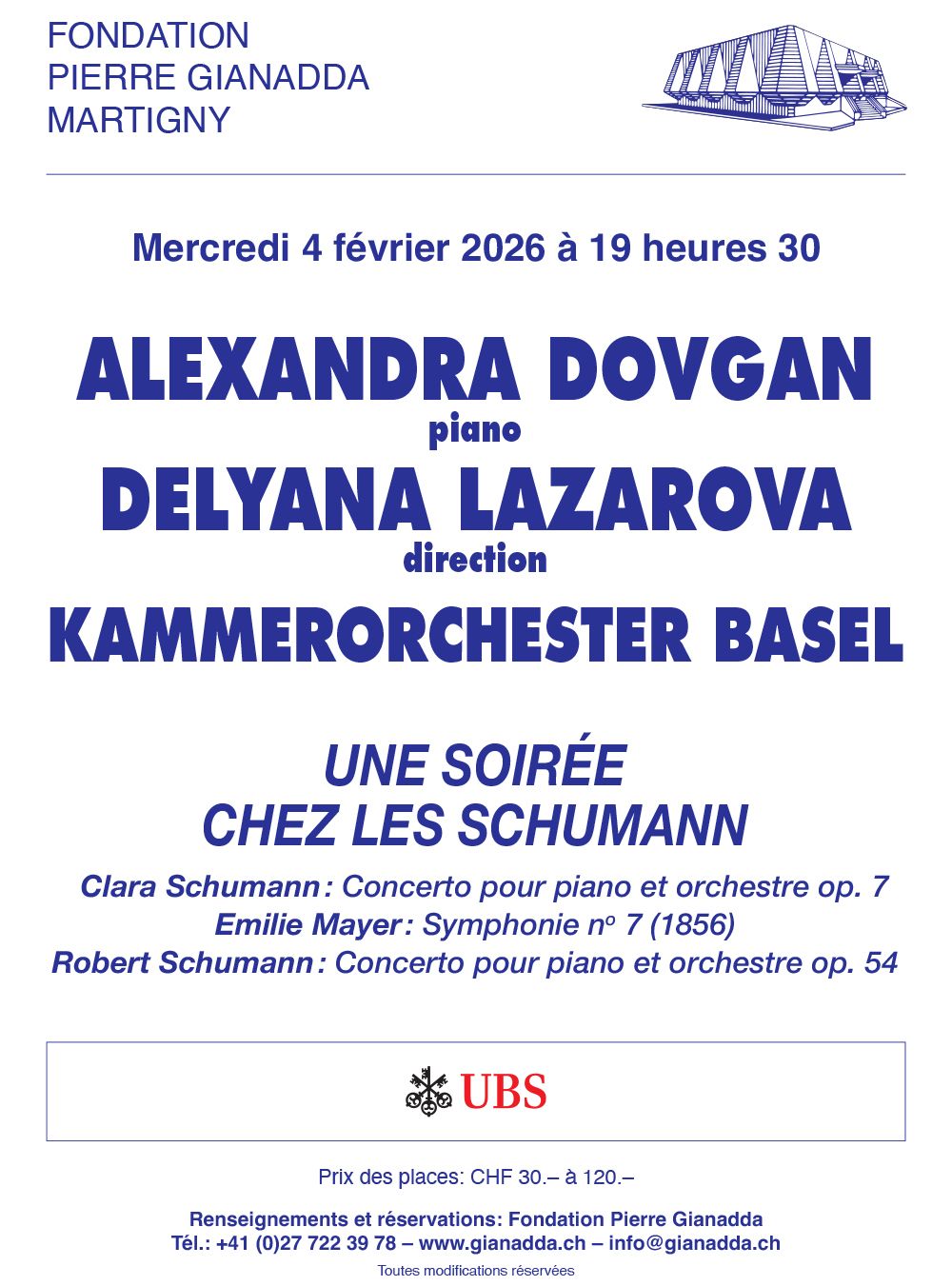 Alexandre Dovgan sera accompagnée de l’Orchestre de Chambre de Bâle, placé sous la direction de Delyana Lazarova, cheffe d’orchestre d’origine bulgare célébrée pour sa sensibilité et sa capacité à créer une sonorité et une atmosphère dans laquelle la musique peut naturellement se développer. Ensemble, les deux musiciennes nous inviteront à une « Soirée chez les Schumann » au cours de laquelle elles interpréteront les deux concertos pour piano et orchestre de Clara et de Robert Schumann, entrecoupés d’une symphonie de la compositrice romantique allemande Emilie Mayer.