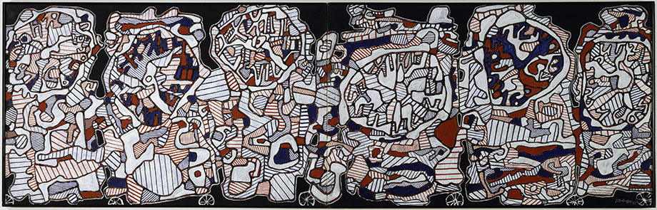 Riche de plus de dix mille œuvres répertoriées au catalogue raisonné, le travail polymorphe de Jean Dubuffet couvre six décennies du XXe siècle. Aussi, pour rendre compte de tous les aspects de sa création, l’exposition présentée à la Fondation Pierre Gianadda s’articule autour de temps forts, faisant alterner chefs-d’œuvre de sa peinture et ensembles majeurs de travaux sur papier (dessins et gouaches), présentés selon un déroulement chronologique.